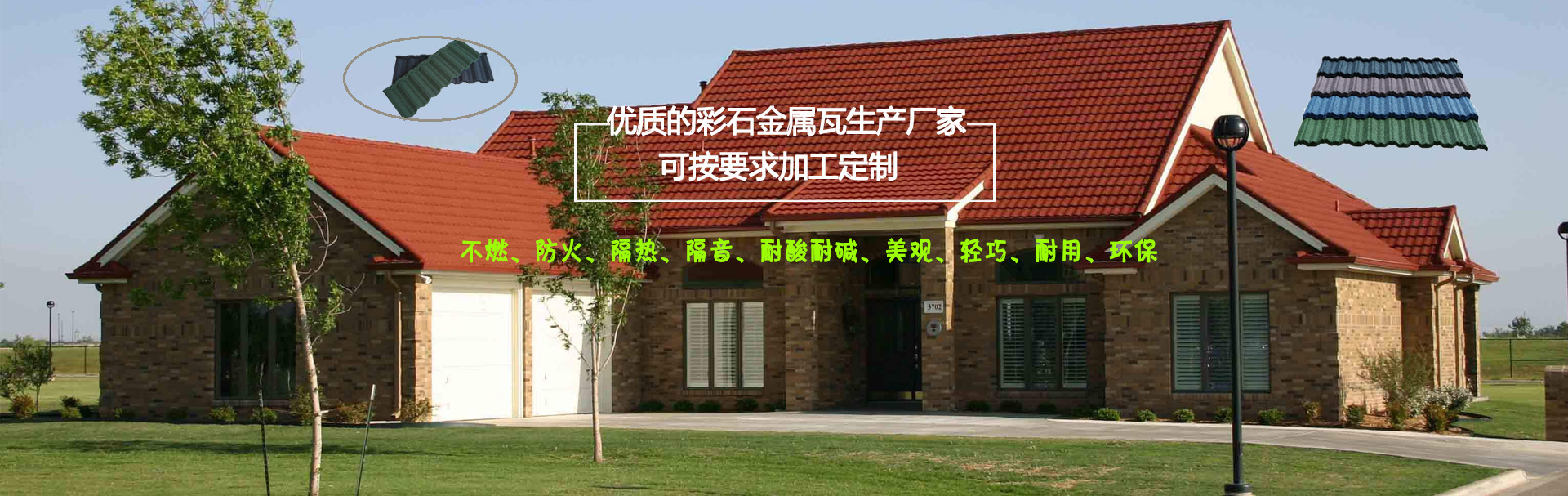 我們是一家彩石金屬瓦設備、設計、制造、銷售、安裝及服務于一體的公司 以過硬的產品質量,優惠的產品價格,令人滿意的銷售服務,贏得您的支持與信賴。 彩石金屬瓦以防腐性能優異的鍍鋁鋅鋼板為基板,以耐候性強的丙烯酸樹脂為黏合劑,以彩色天然沙礫為面層的新型屋面材料。